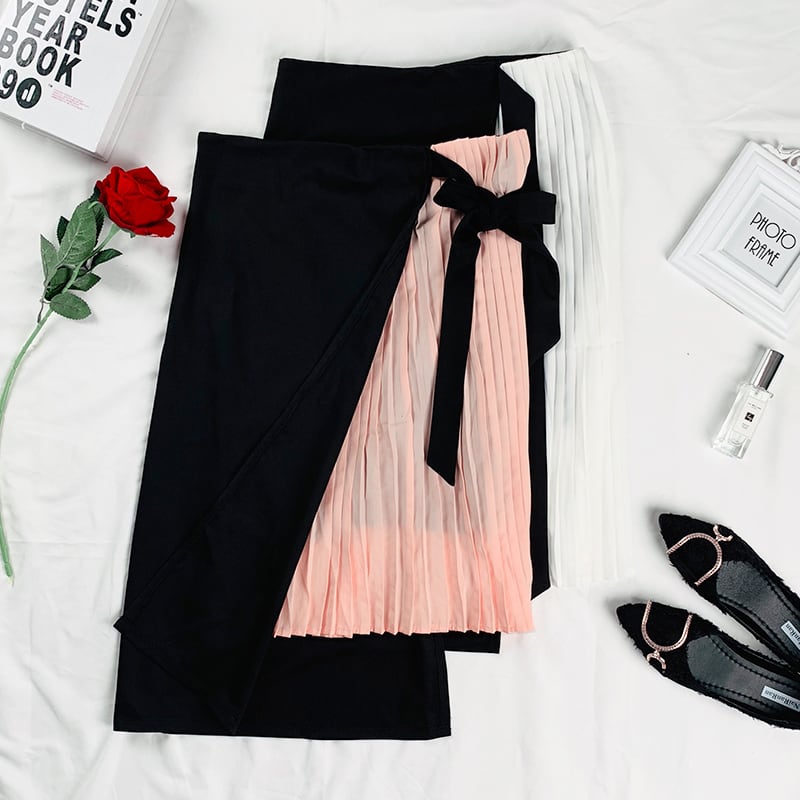 バイカラー ロングスカート エレガント プリーツ ウエストリボン レイヤード アンバランス丈 aya1227