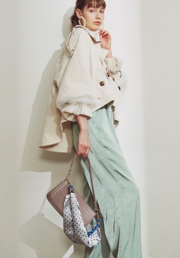 チュールを重ねたボリュームスリーブがフェミニンで可愛いショートトレンチコート。