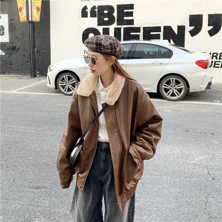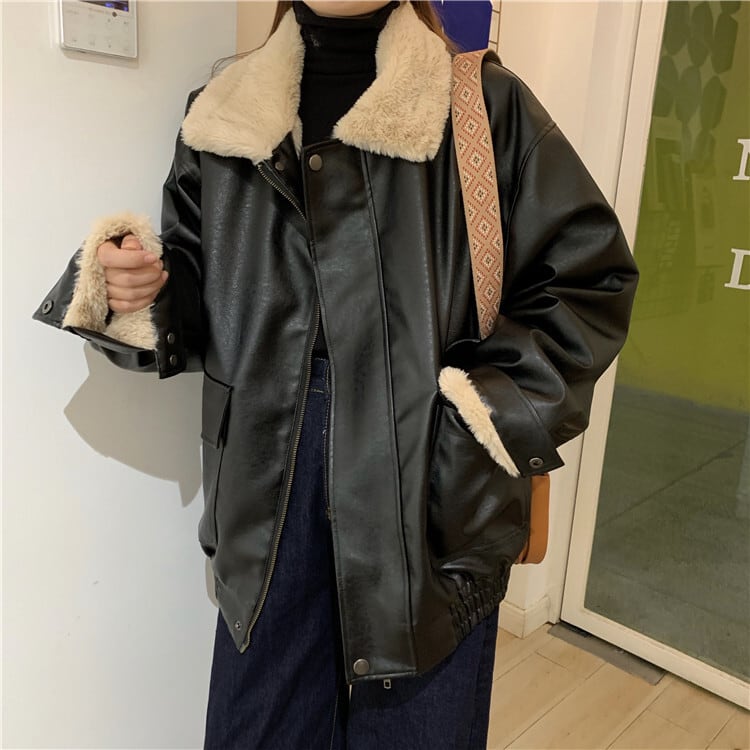 PUレザー ルーズ ジャケット ファー襟 レトロ オーバーサイズ カジュアル 無地 クール フロントジッパー 長袖 aya3277