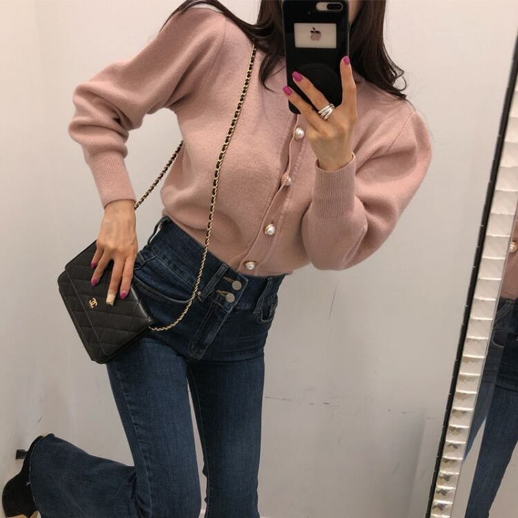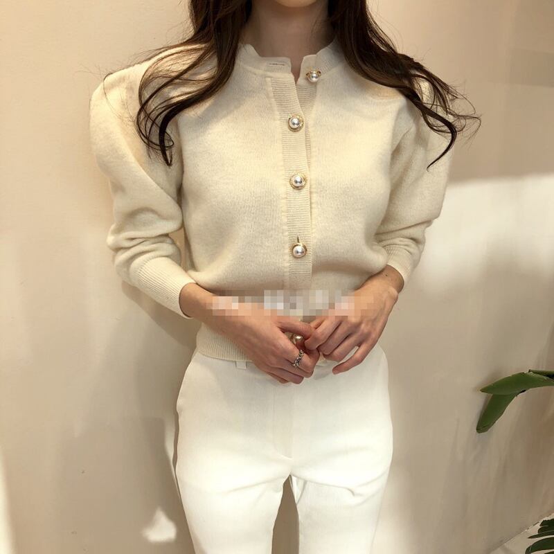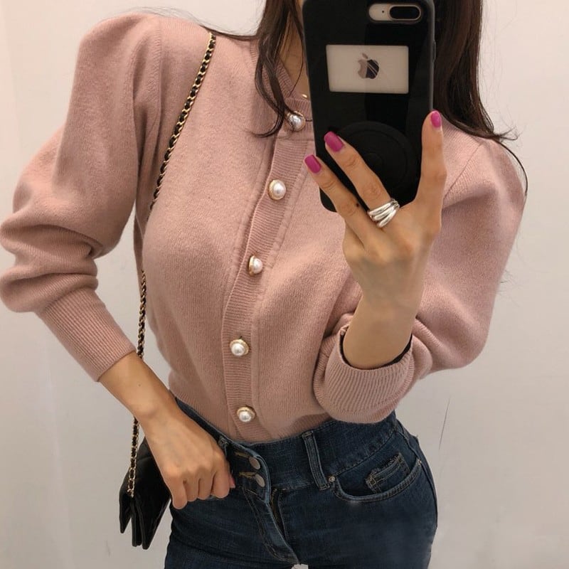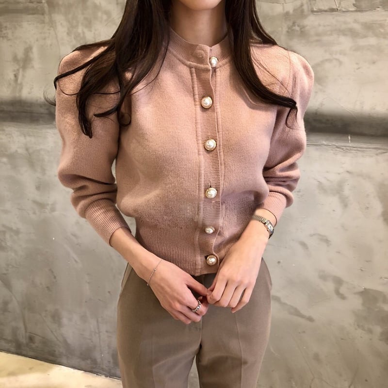 上品なパールボタンにパフスリーブが女性らしいニットカーディガン。