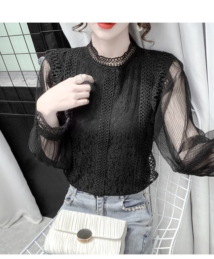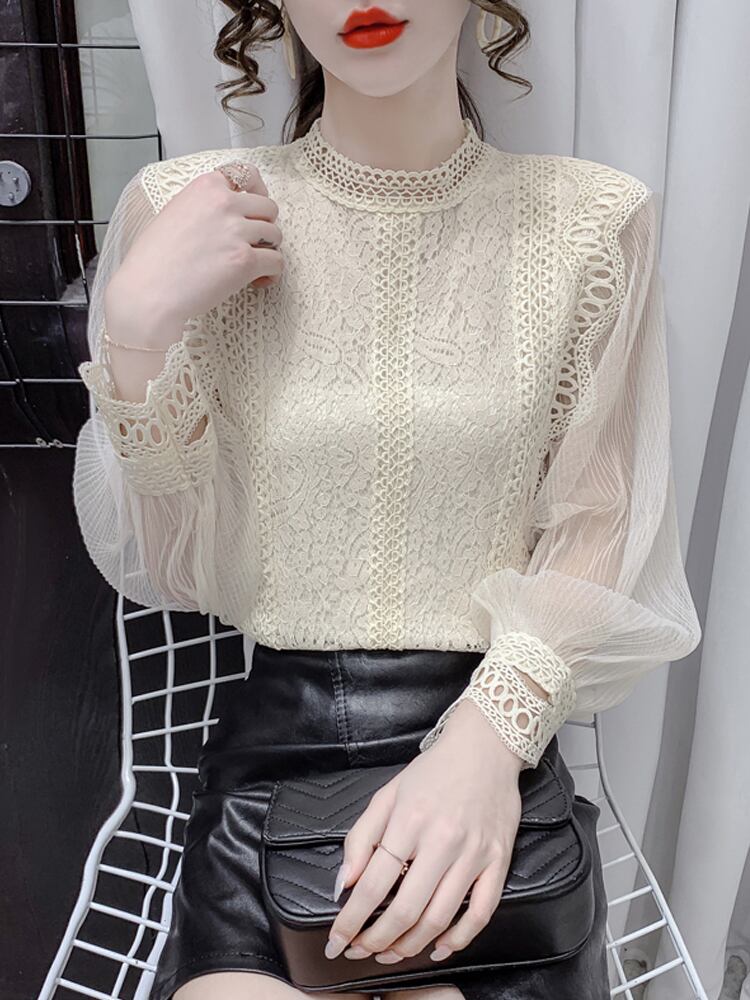 レース刺繍 シースルースリーブ ブラウス 長袖 パフスリーブ エレガント スタンドカラー フェミニン オフィス フォーマル aya3294
