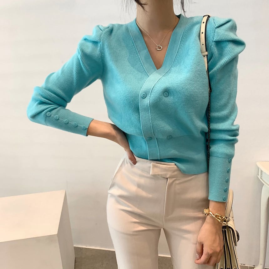 パフショルダー ニット カーディガン ダブルブレスト Vネック レトロ フレンチ スリム 長袖 無地 カジュアル オフィス エレガント aya3299
