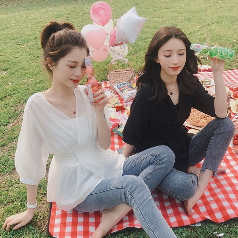 カシュクール ブラウス Vネック ぺプラム ウエストスリム シースルー シフォン 半袖 カジュアル オフィス フェミニン エレガント aya3559