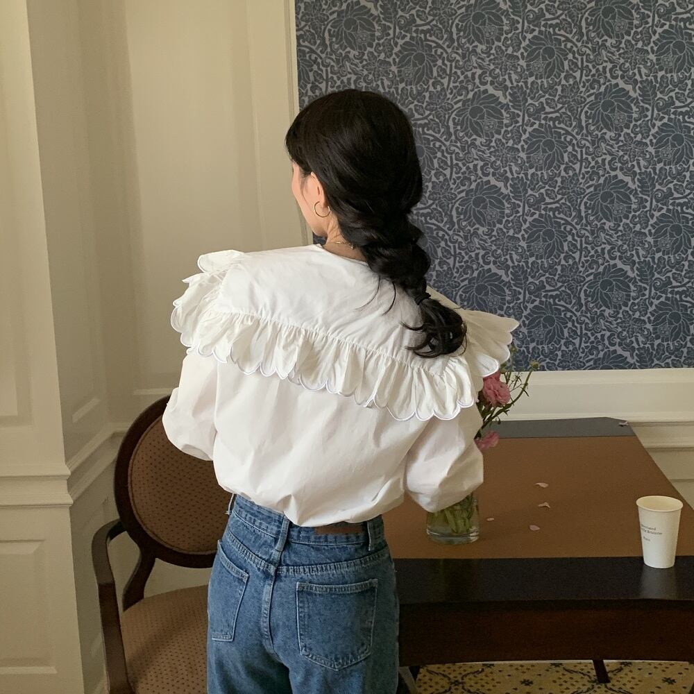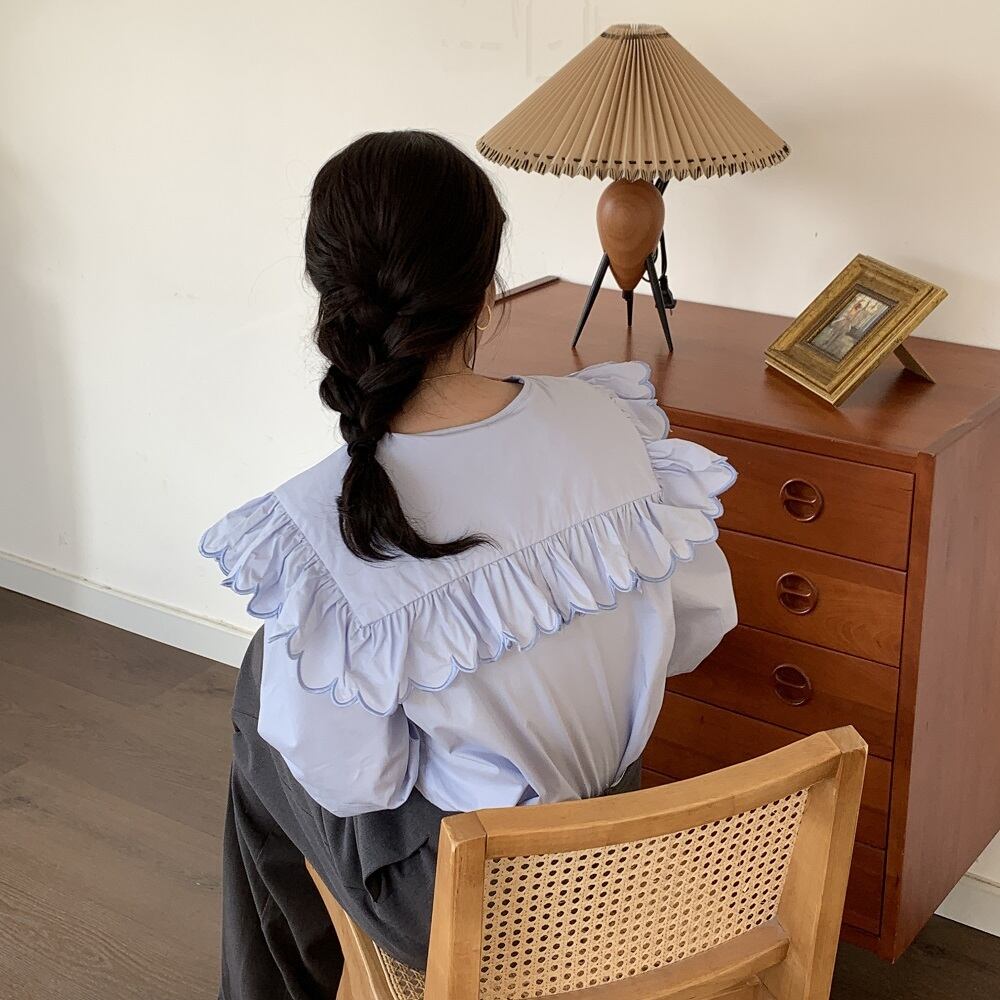 大きな襟が目を惹くブラウス。