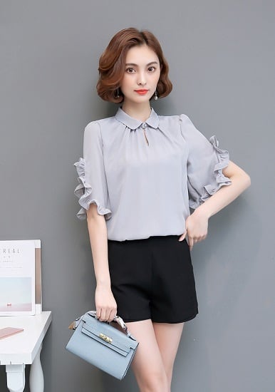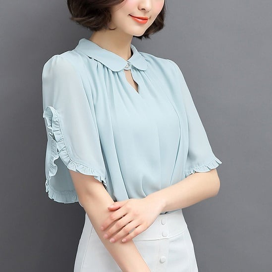 フリル袖で可愛さUPの半袖シフォンブラウス。