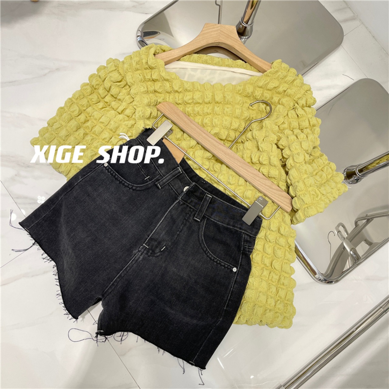 ワッフル 半袖 ブラウス ポップコーン パフスリーブ カジュアル フェミニン CUTE ラウンドネック オフィス aya3567
