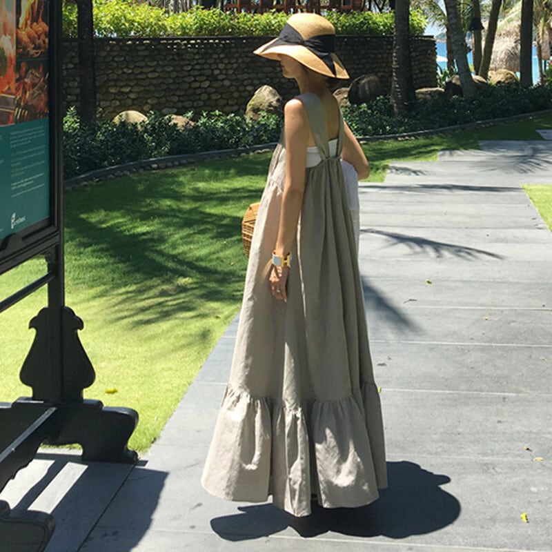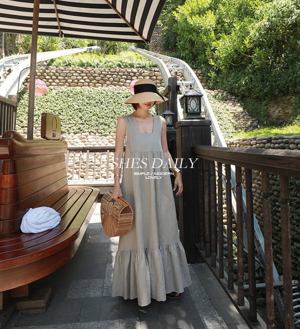 ノースリーブ スクエアネック ワンピース ロング フリル ハイウエスト Aライン フレア フェミニン カジュアル aya3578