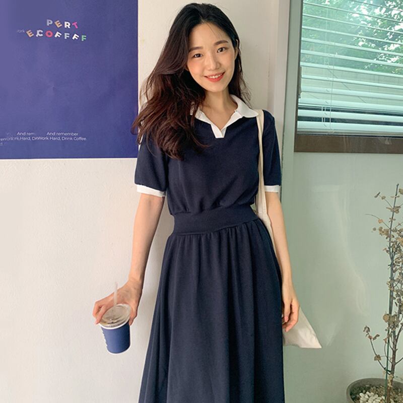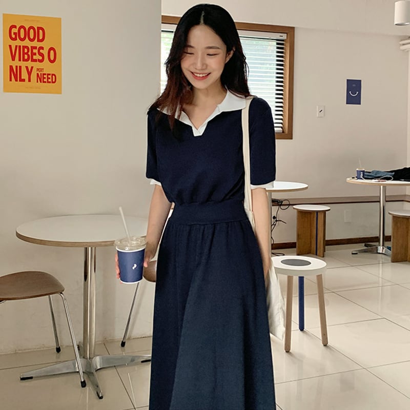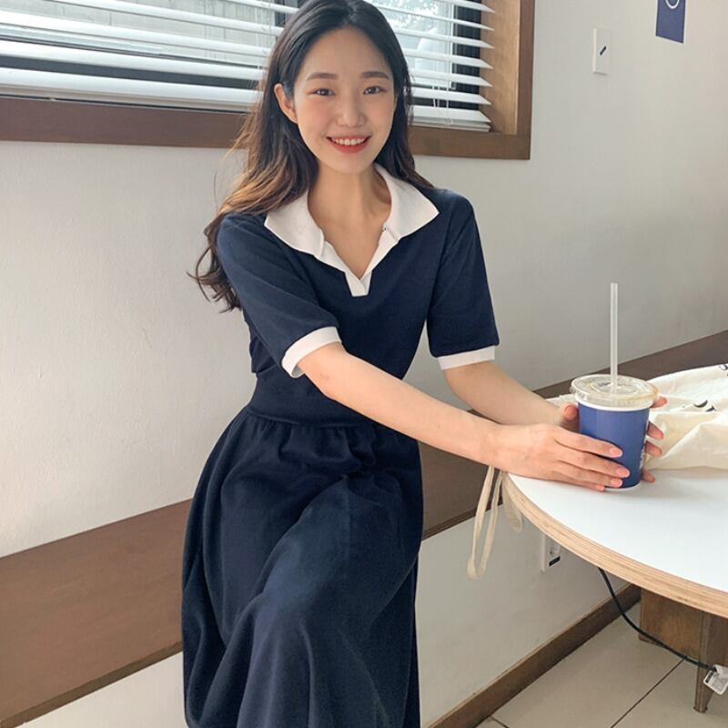 襟付き ウエストスリム ワンピース 半袖 無地 バイカラー ロング レトロ Aライン フレア カジュアル エレガント オフィス aya3592