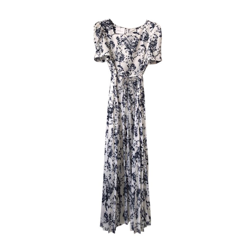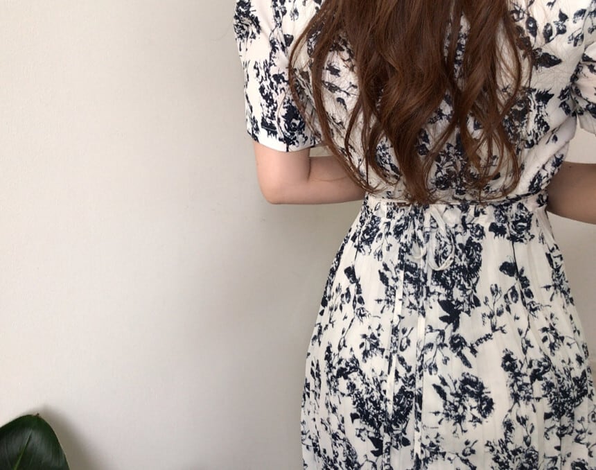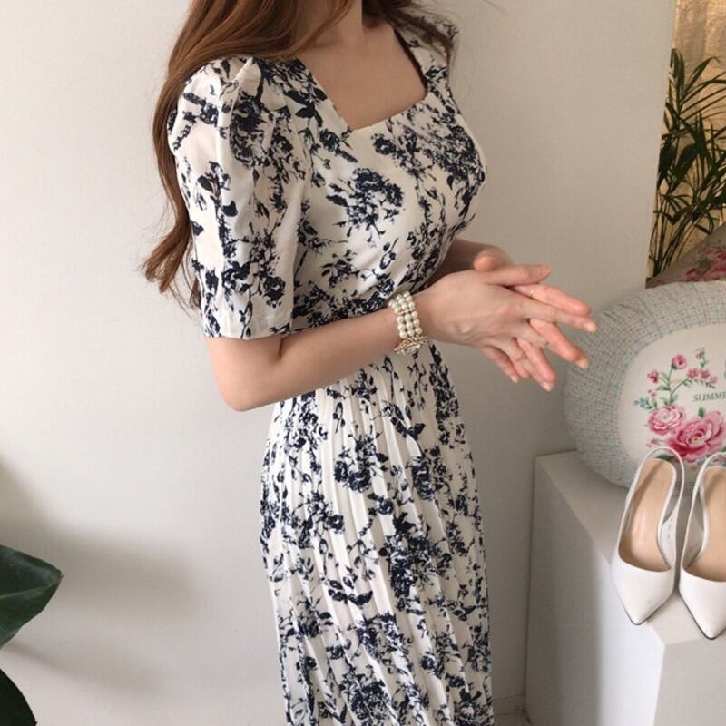 花柄 半袖 ワンピース プリーツ スクエアネック ロング パフスリーブ リボン ウエストスリム ハイウエスト レトロ カジュアル フェミニン aya3613