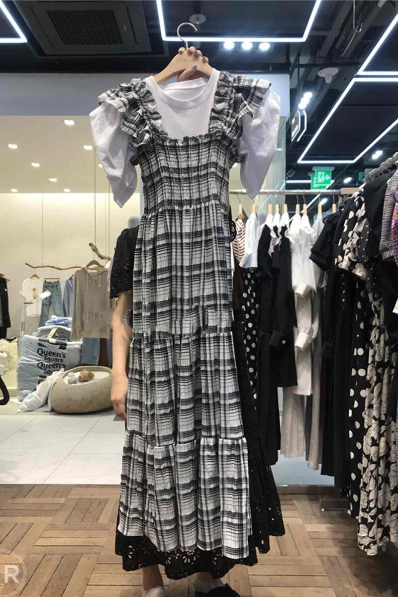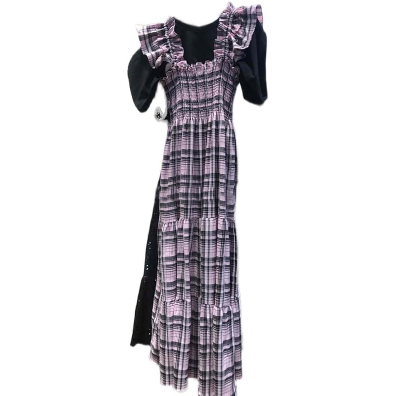 チェック柄 ショルダーフリル ワンピース マキシ丈 ノースリーブ ティアード ハイウエスト フリル ビーチ リゾート カジュアル フェミニン aya3615