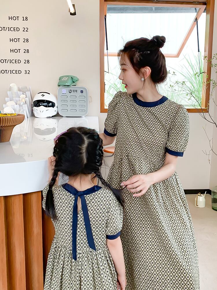 チェック柄 花柄 ワンピース 半袖 バックリボン フレア レトロ カジュアル CUTE ラウンドネック ミモレ丈 aya3625