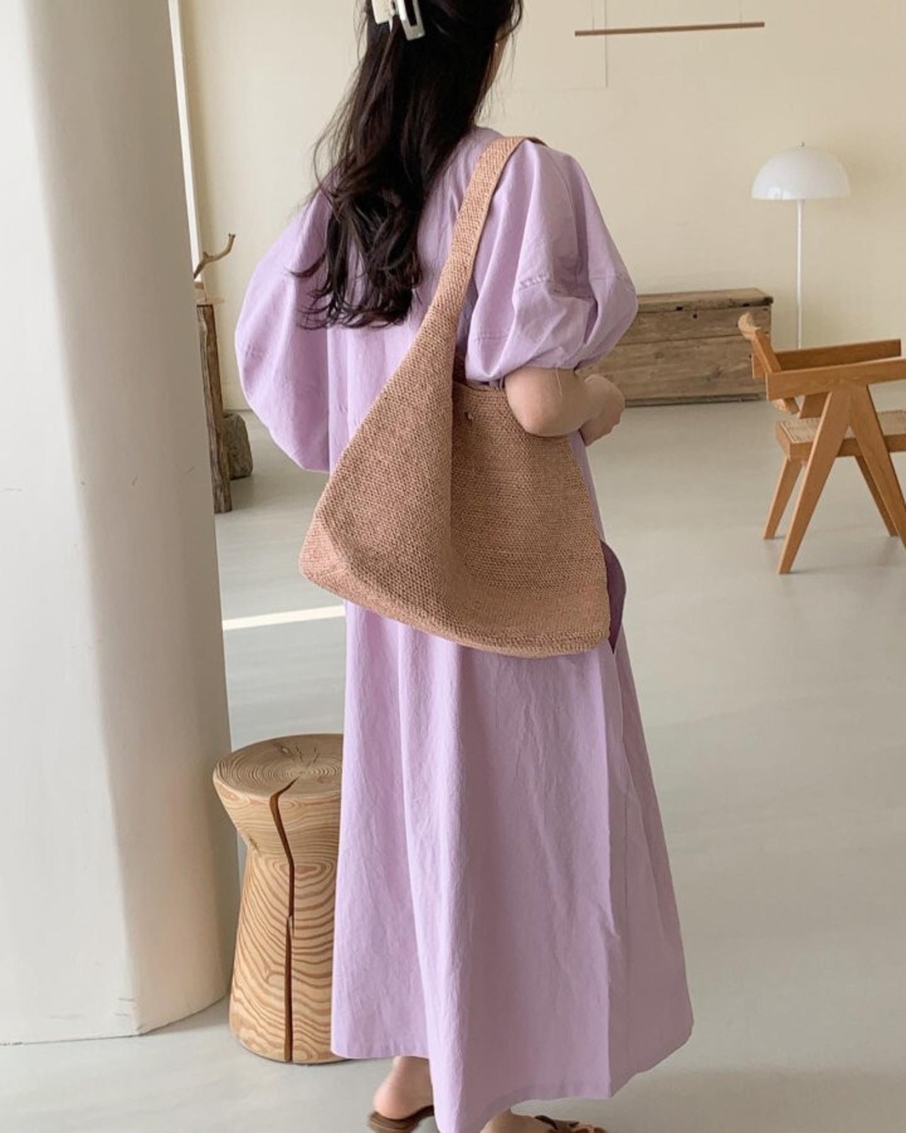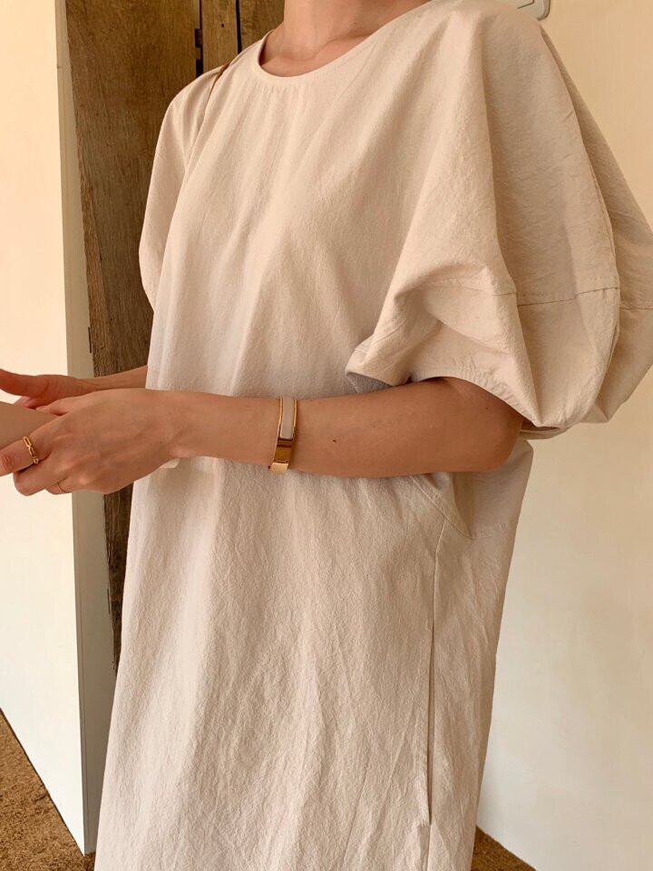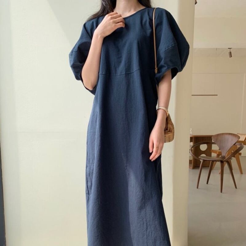 パフスリーブ ルーズ ワンピース シンプル 半袖 無地 カジュアル ラウンドネック ミモレ丈 フェミニン aya3628