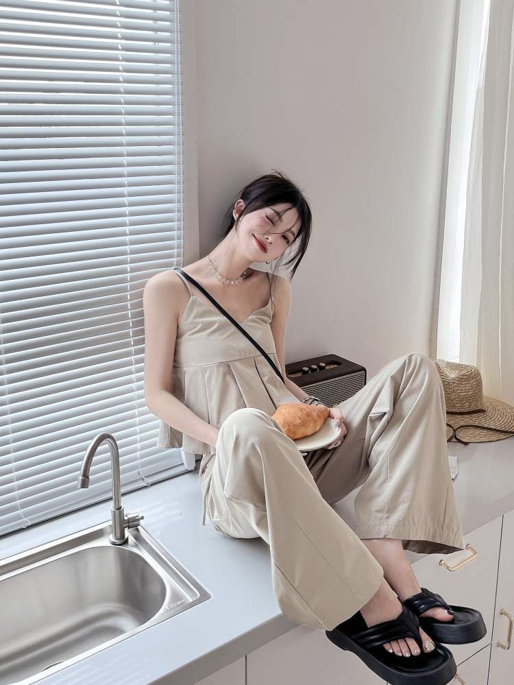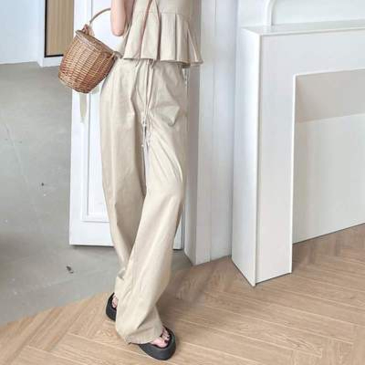 セットアップ キャミソール ワイドパンツ リネン フレア プリーツ Aライン ルーズ 無地 カジュアル フェミニン Vネック ロング aya3645
