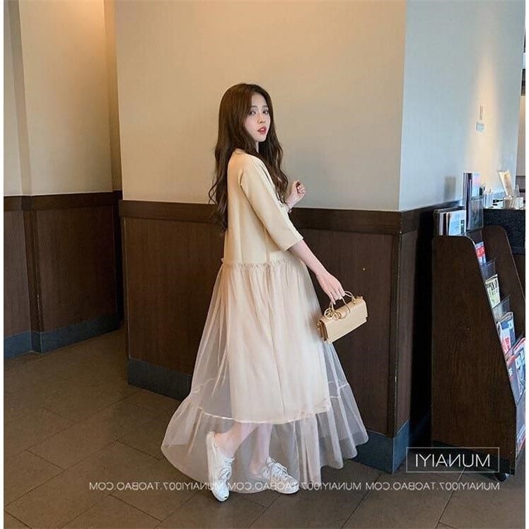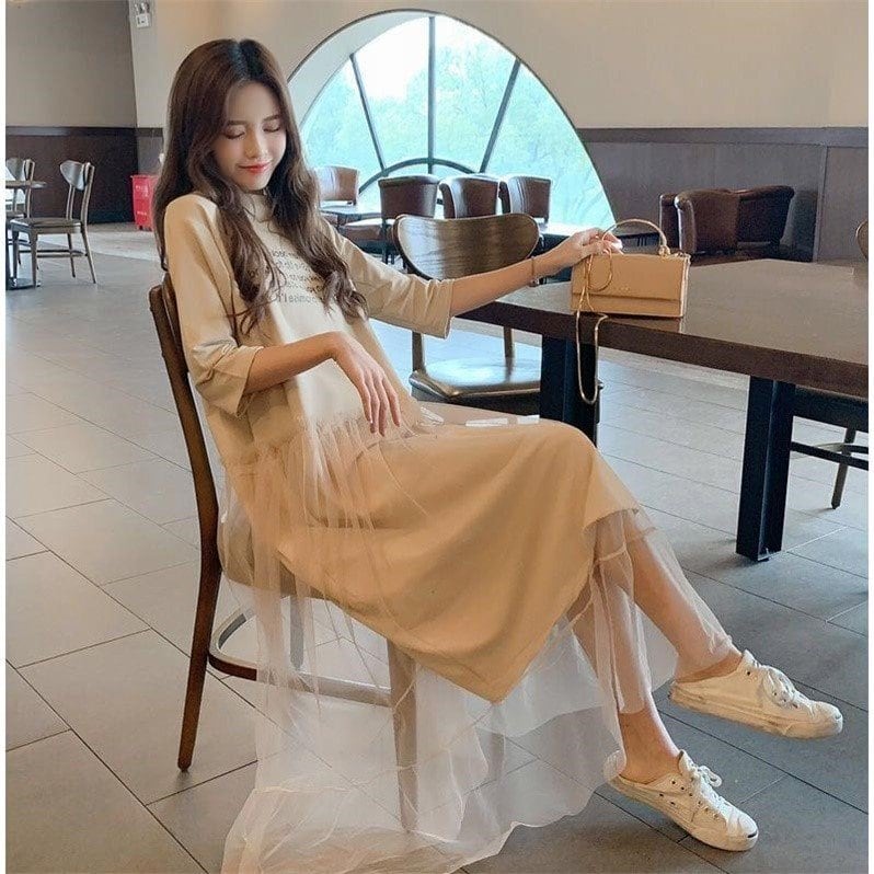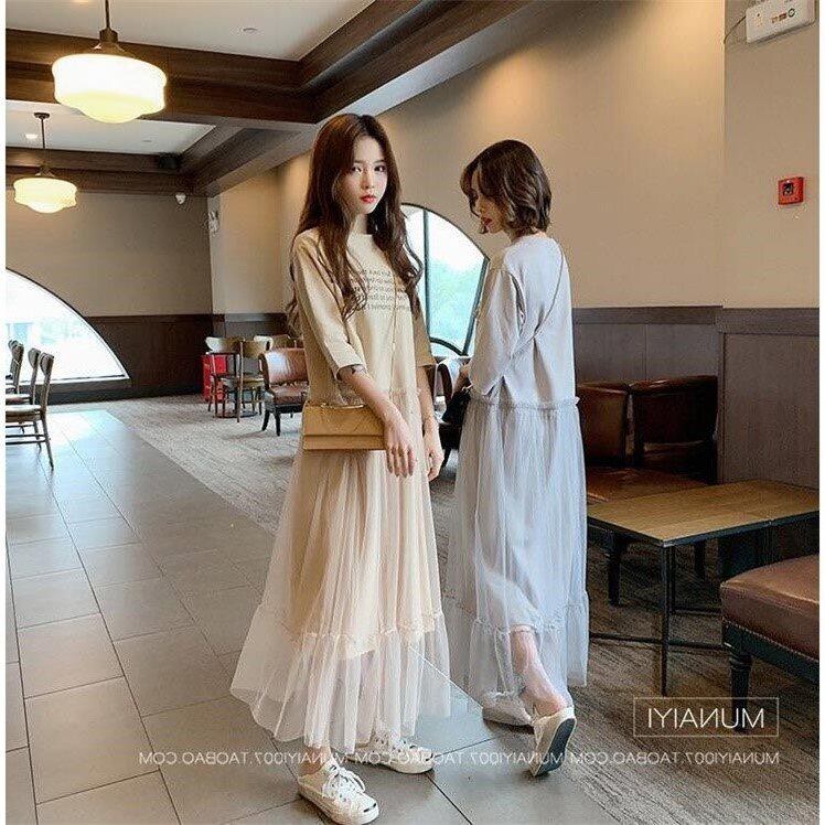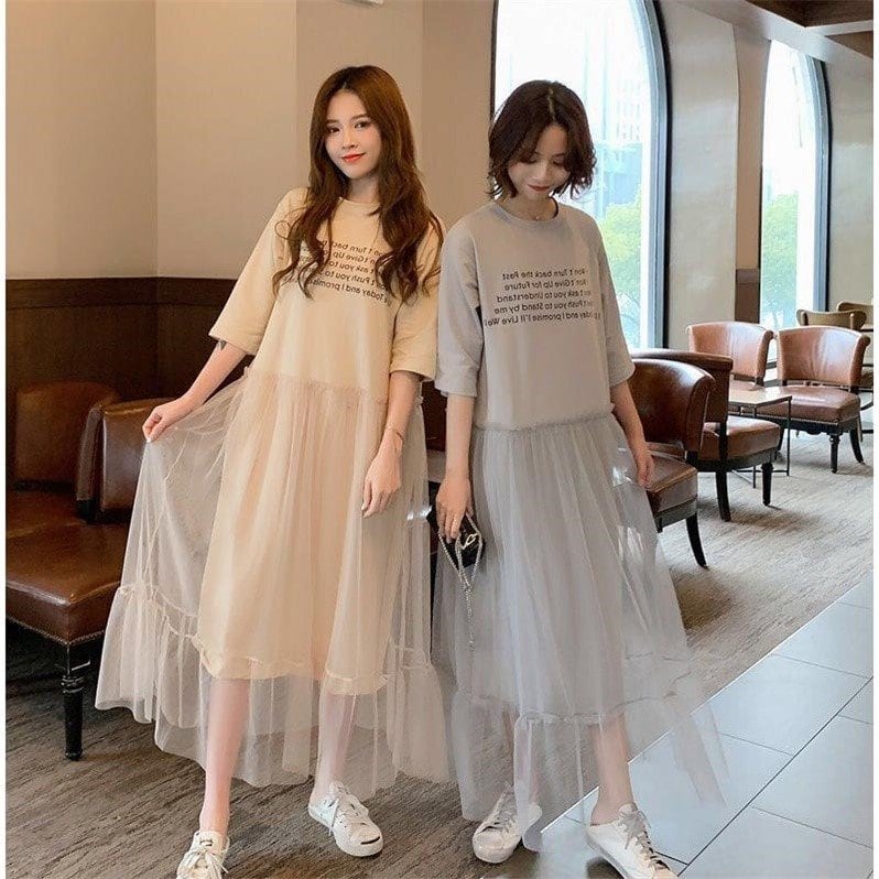 ロゴ Tシャツワンピース チュール ラウンドネック 半袖 マキシ丈 裾フリル カジュアル CUTE ルーズ aya3649