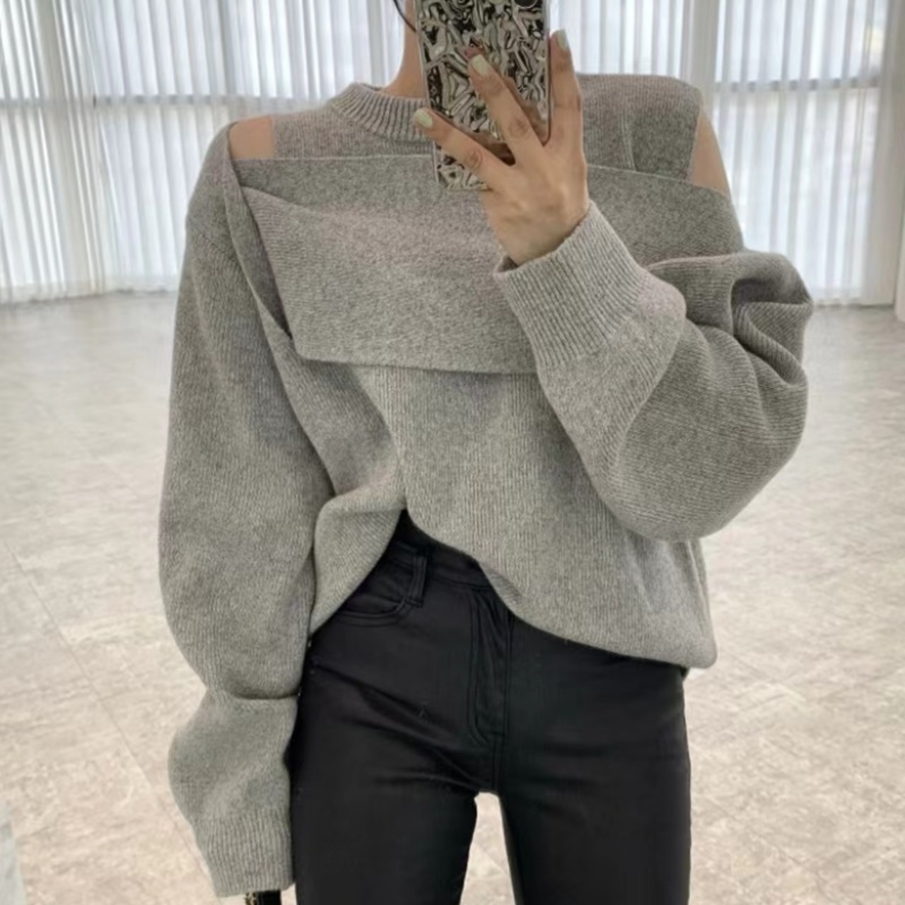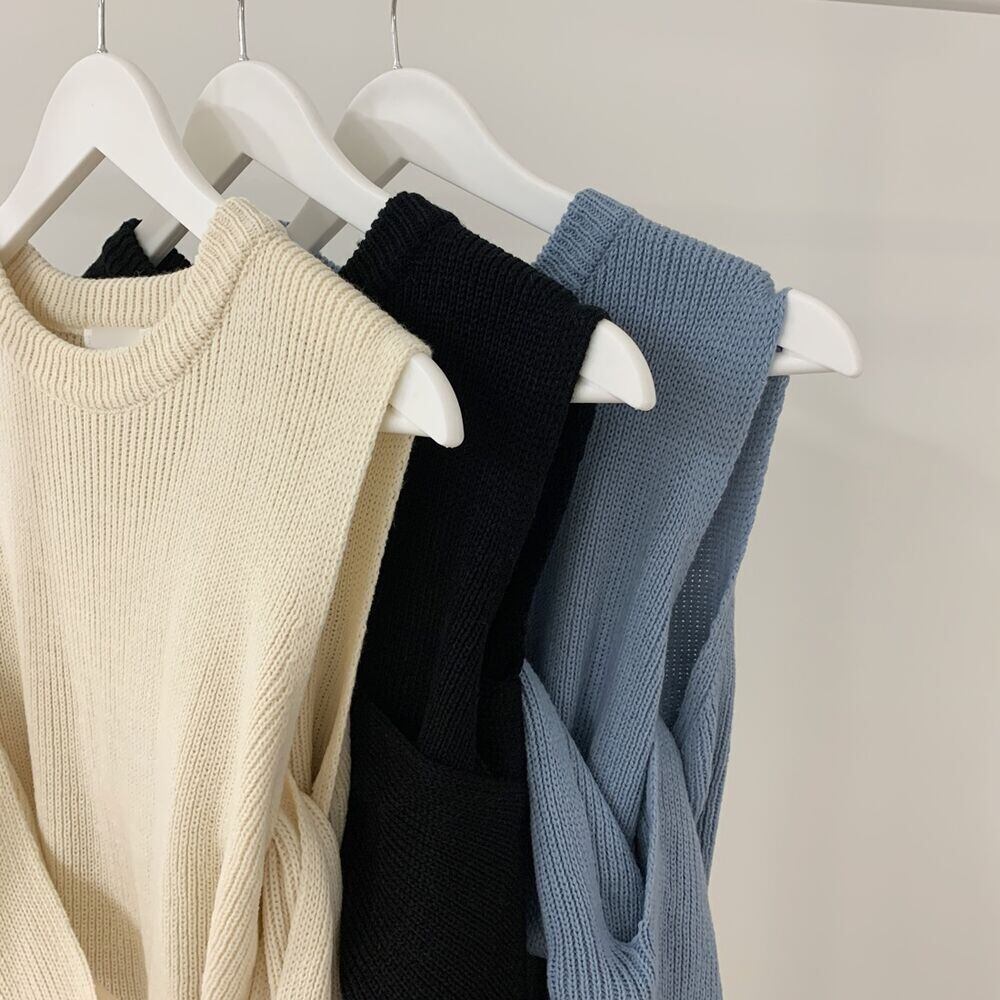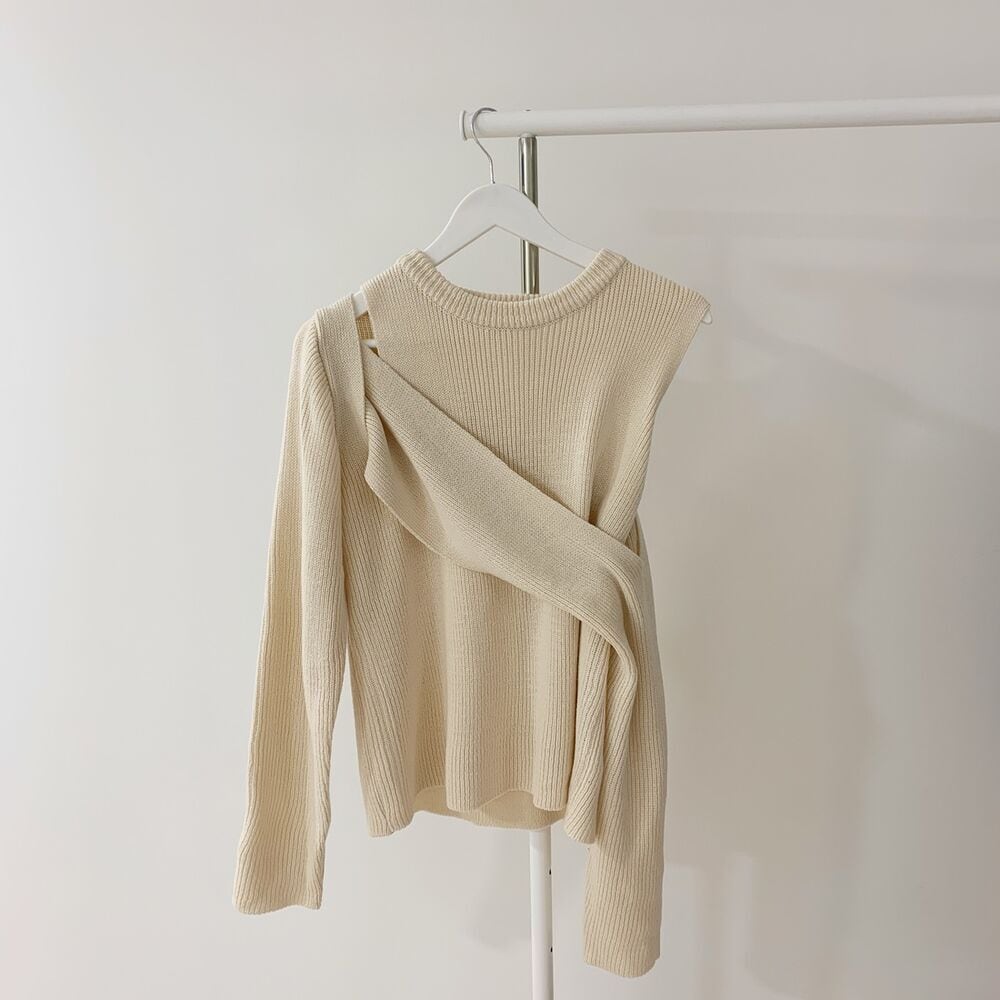 ショルダースリット&アシンメトリーデザインがオシャレなニットトップス。