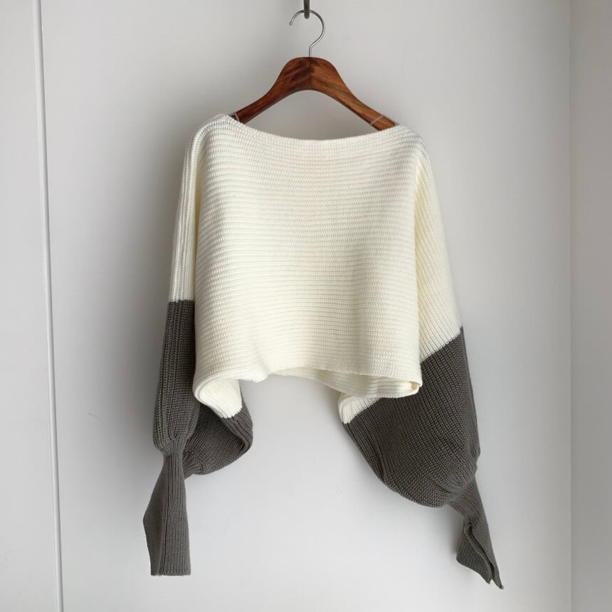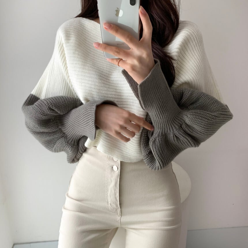 ボリュームスリーブ ショート丈 ニット 袖スリット ボートネック ルーズ ドルマンスリーブ カジュアル CUTE aya3664