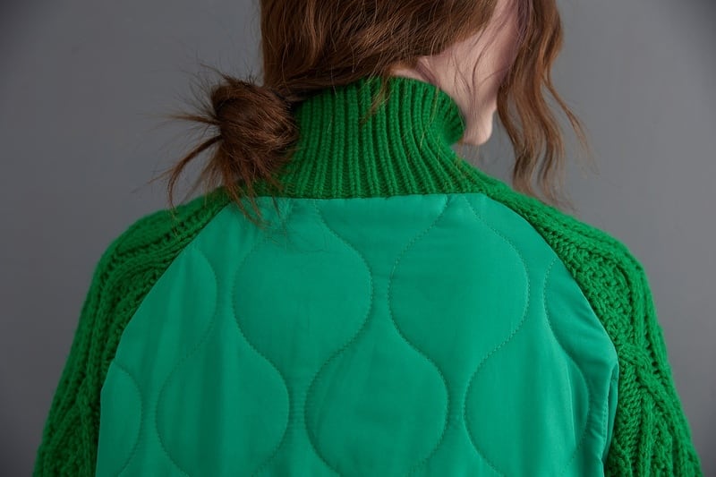 キルティングとのドッキングデザインがオシャレなケーブル編みニットトップス。