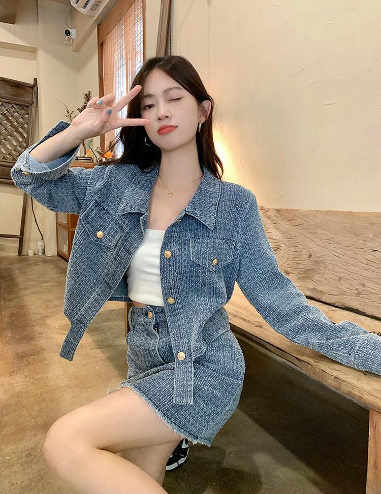セットアップ デニム ジャケット ミニスカート タイト ショート丈 長袖 フリンジ カジュアル ハイウエスト aya3670