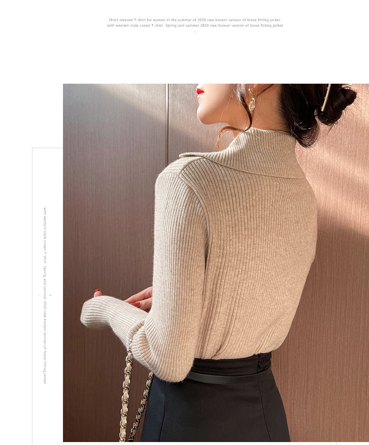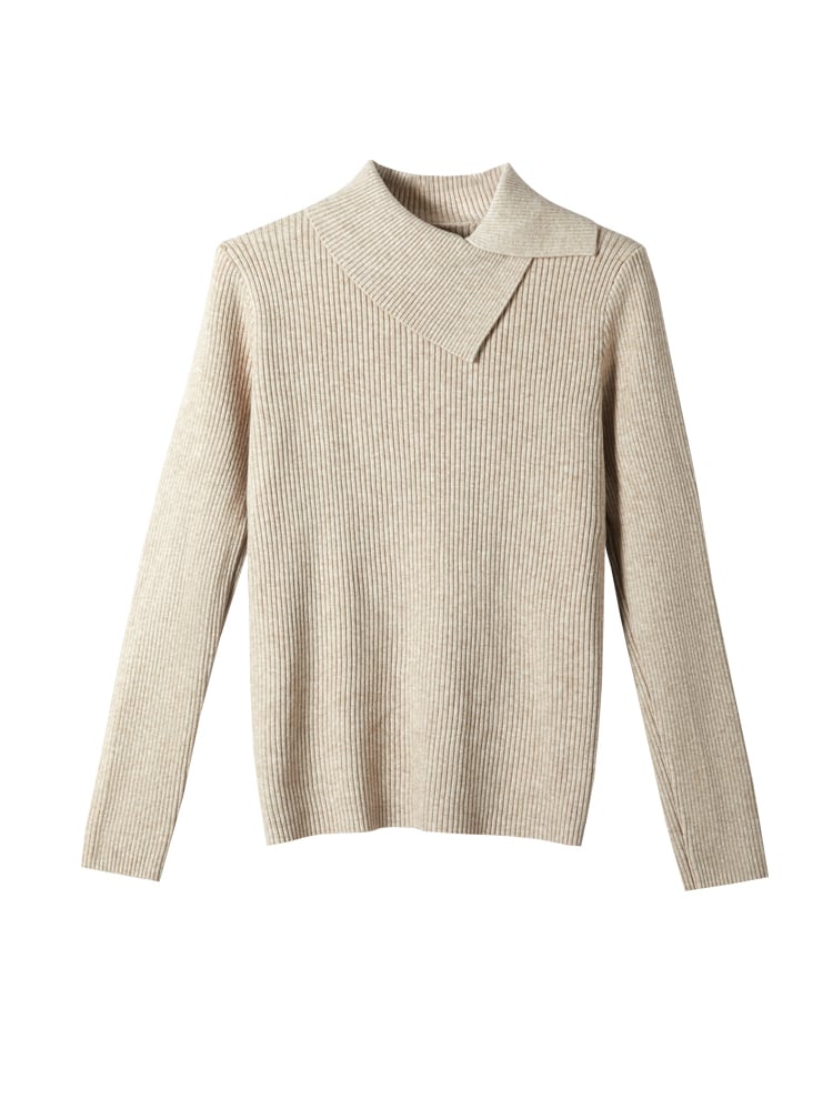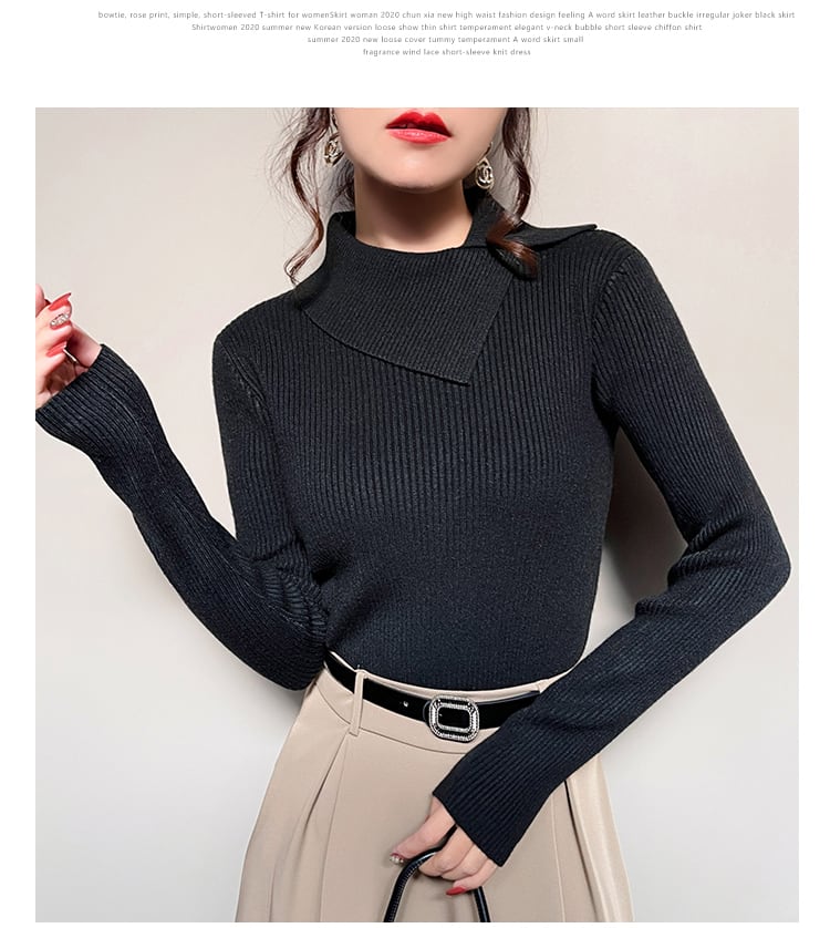 サイドカラー リブニット スリム 長袖 変形襟 無地 カジュアル オフィス シンプル 大人可愛い 上品 aya3688