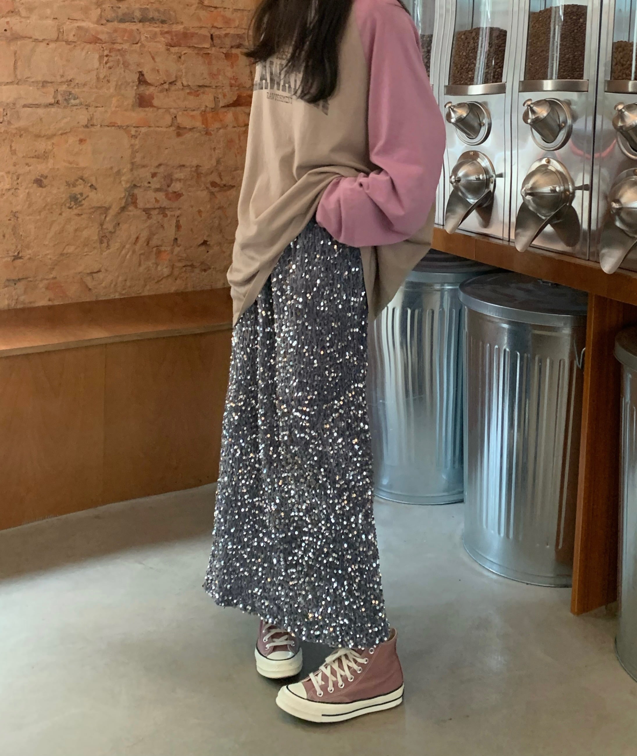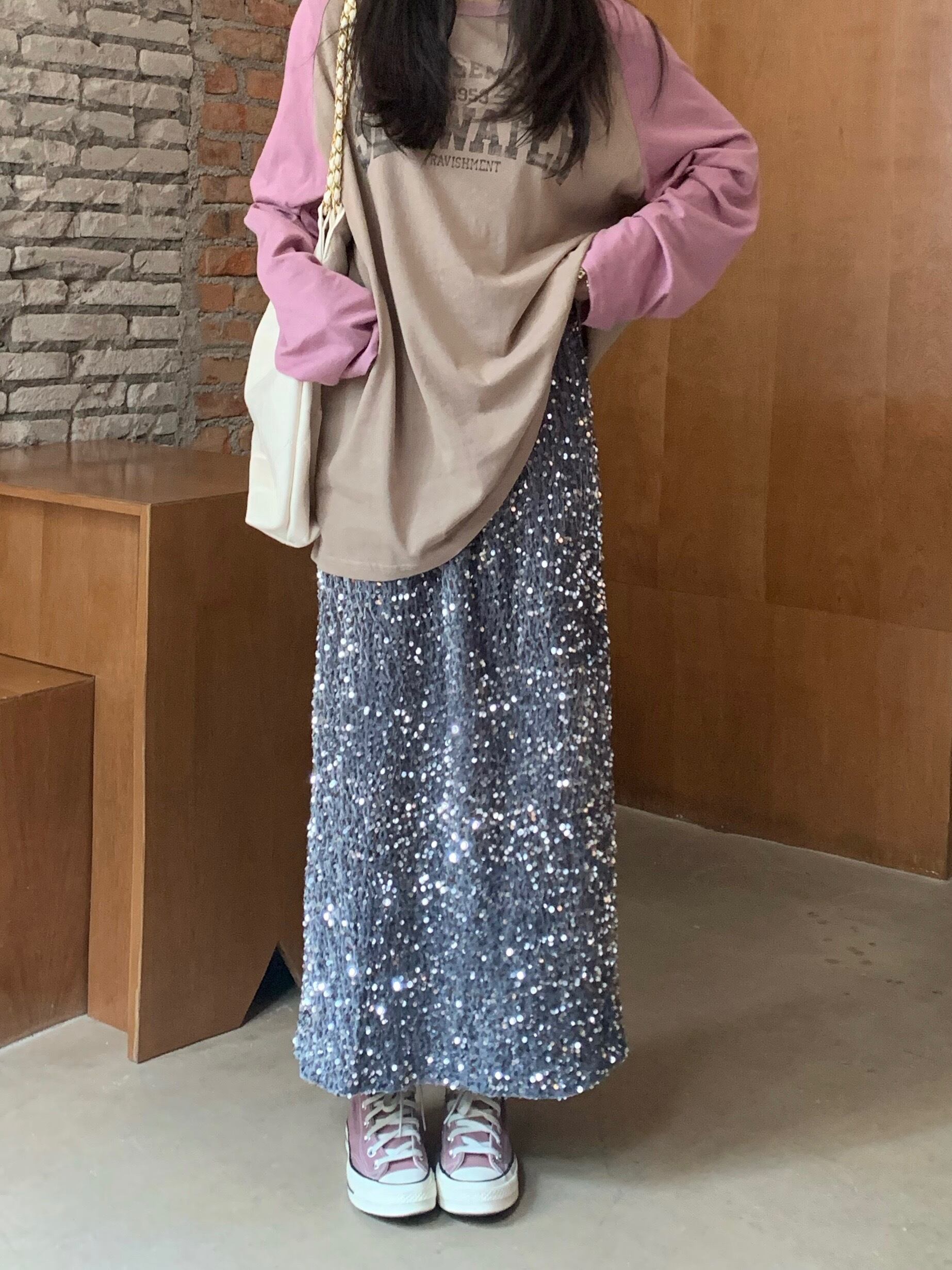 キラキラ反射するスパンコールをあしらったロングスカート。