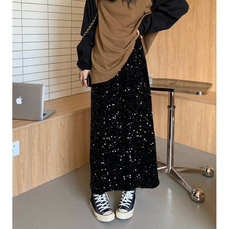 スパンコール ロングスカート ストレート スリット ハイウエスト カジュアル エレガント パーティー aya3692
