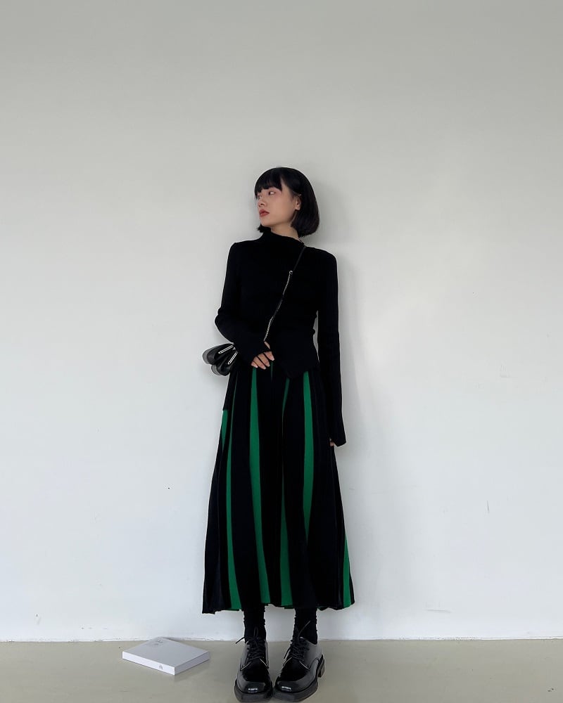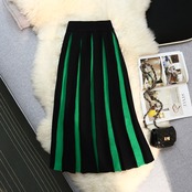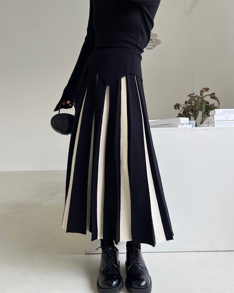 バイカラー ニット プリーツスカート Aライン ハイウエスト ロング カジュアル エレガント レトロ aya3693
