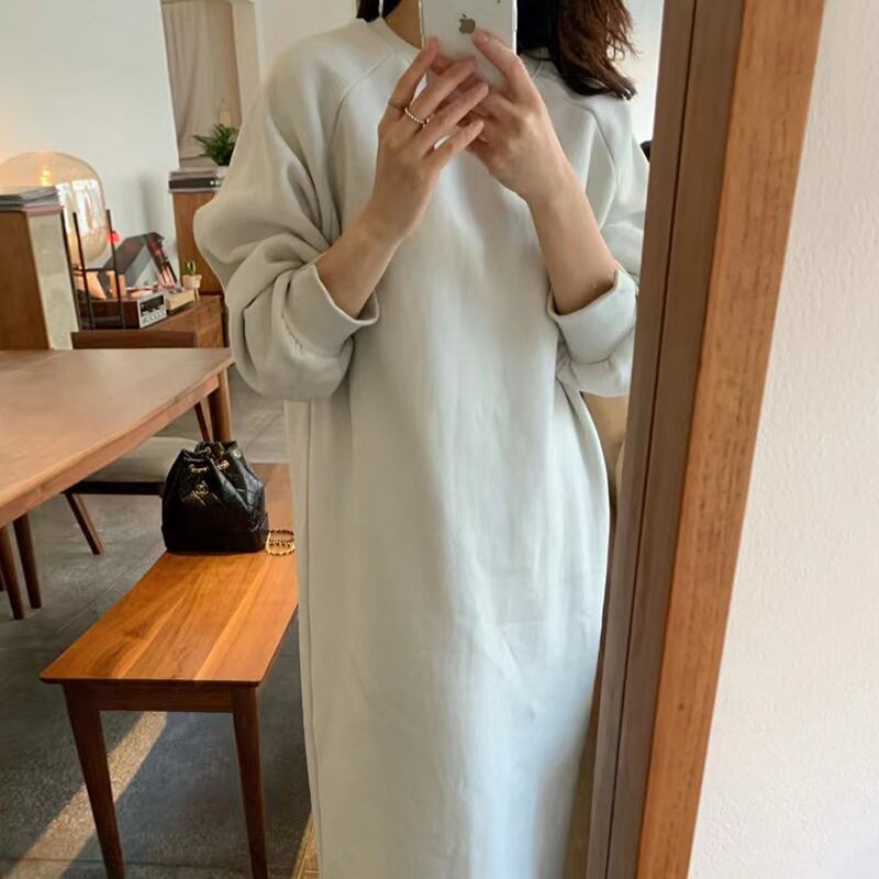 スウェット ロング ワンピース ルーズ カジュアル 袖スリット 長袖 無地 シンプル ラウンドネック aya3695