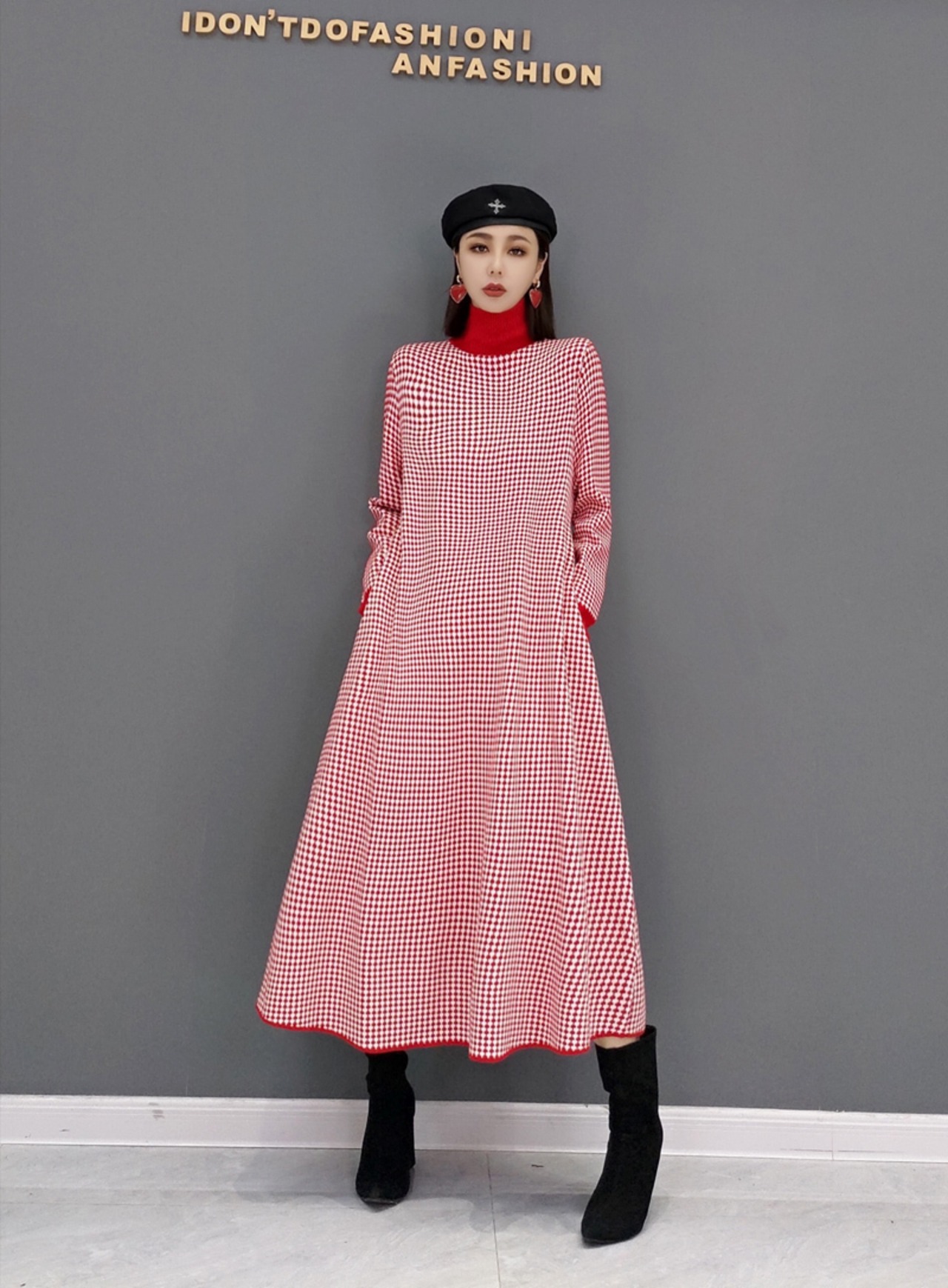チェック柄 ワンピース タートルネック カジュアル ルーズ ロング Aライン 長袖 エレガント オフィス aya3701