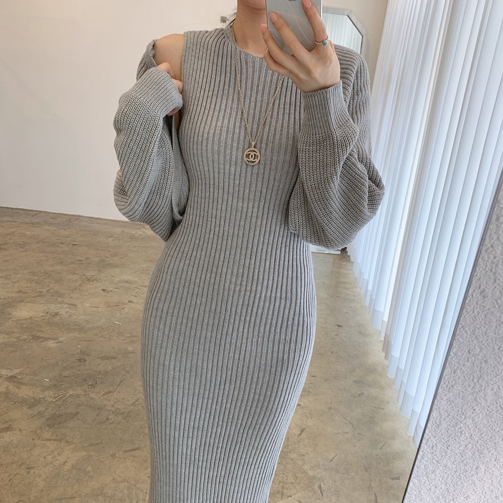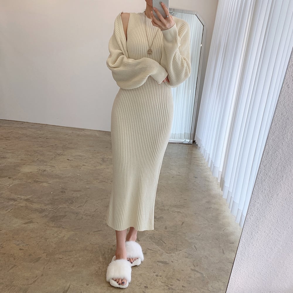 ノースリーブリブニットワンピースとボレロカーディガンのセットアップ。