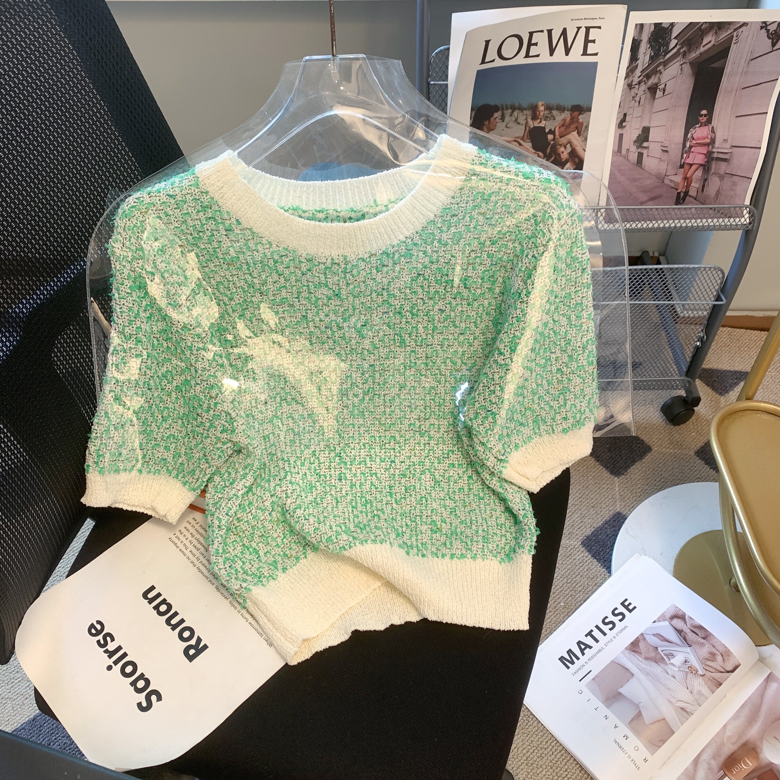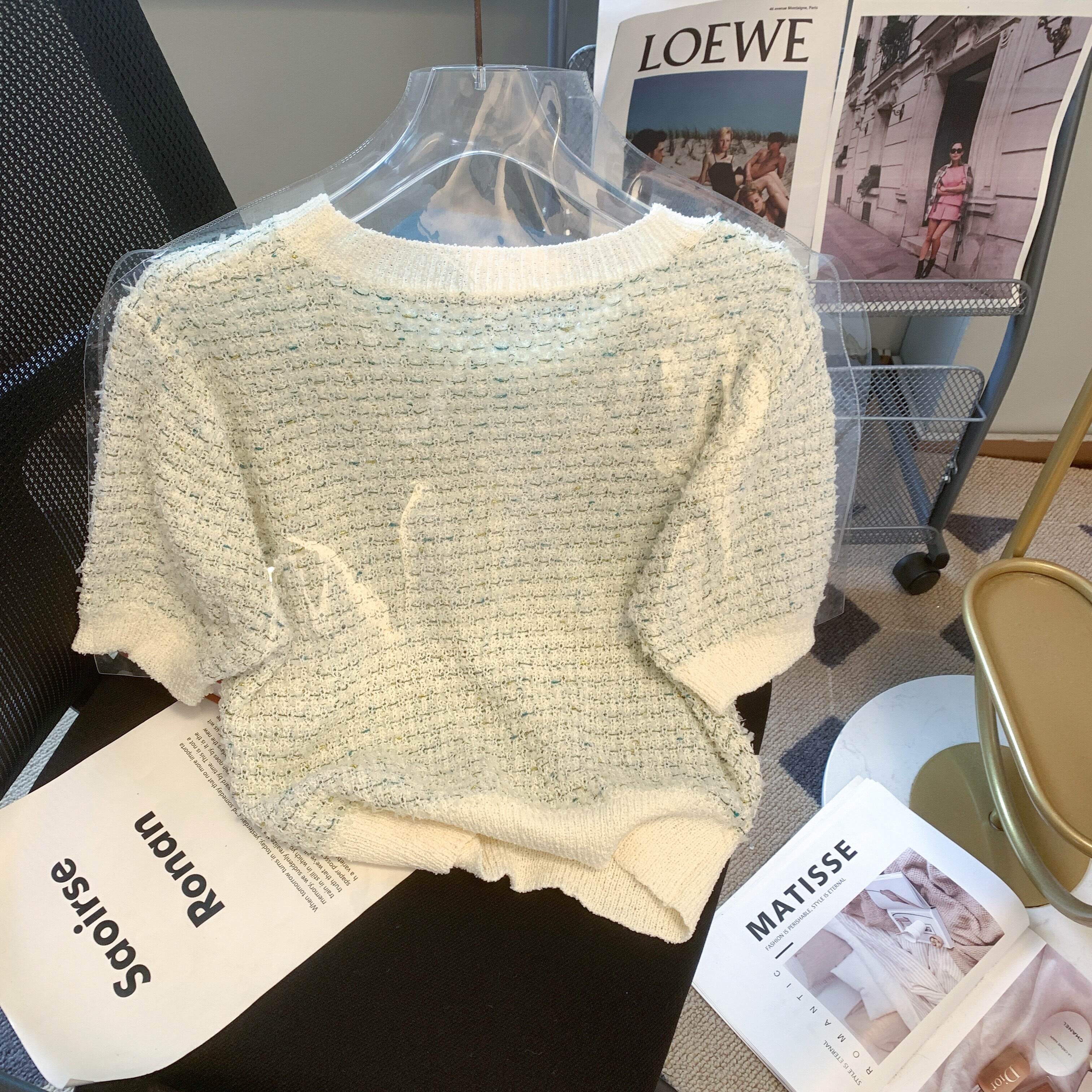 ラメ ツイード ニット 半袖 ラウンドネック ショート丈 Tシャツ 大人 上品 パフスリーブ フェミニン エレガント aya3718